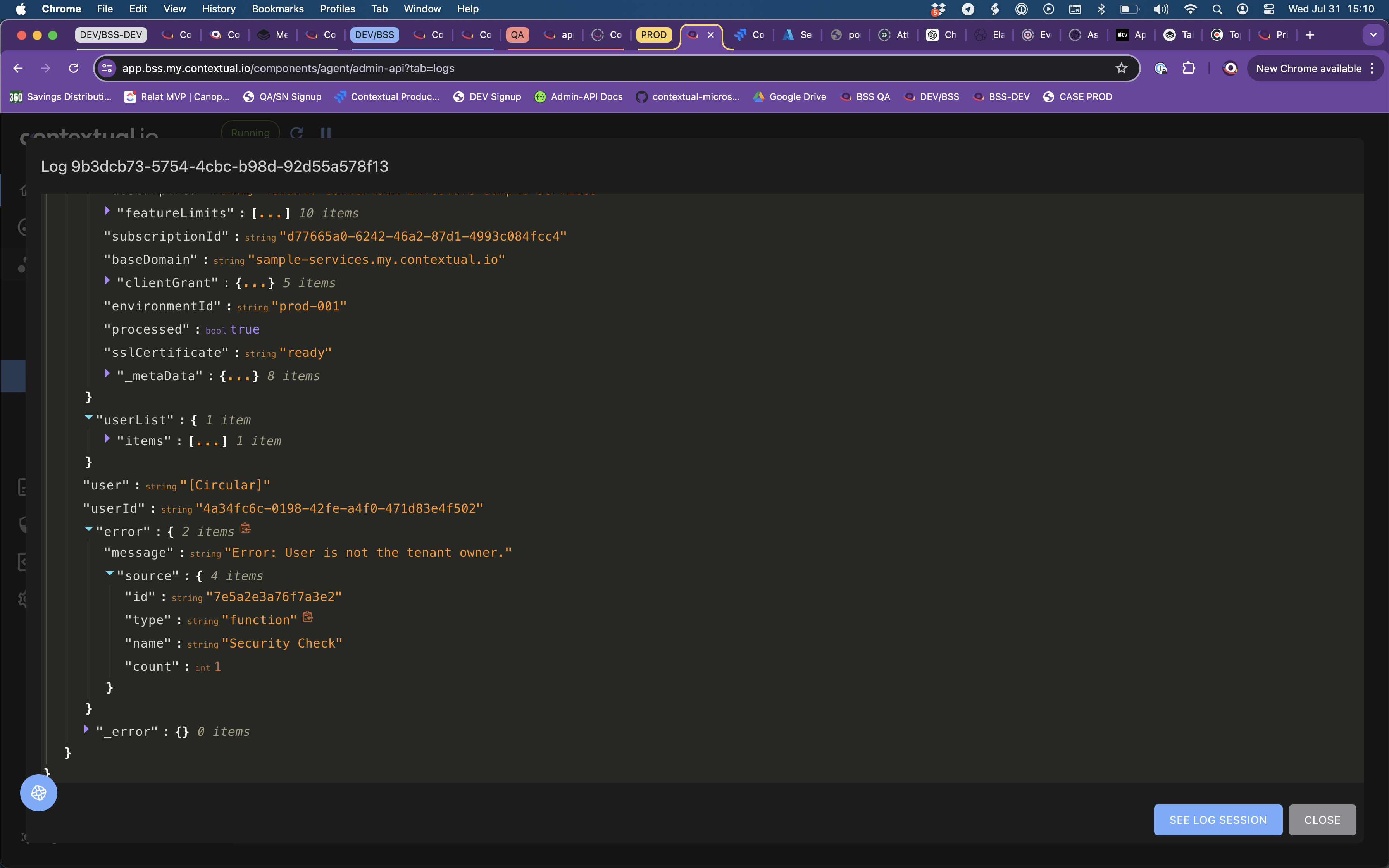 Finally, you can open the log session associated with this message by using the "See Log Session" button in the lower right.