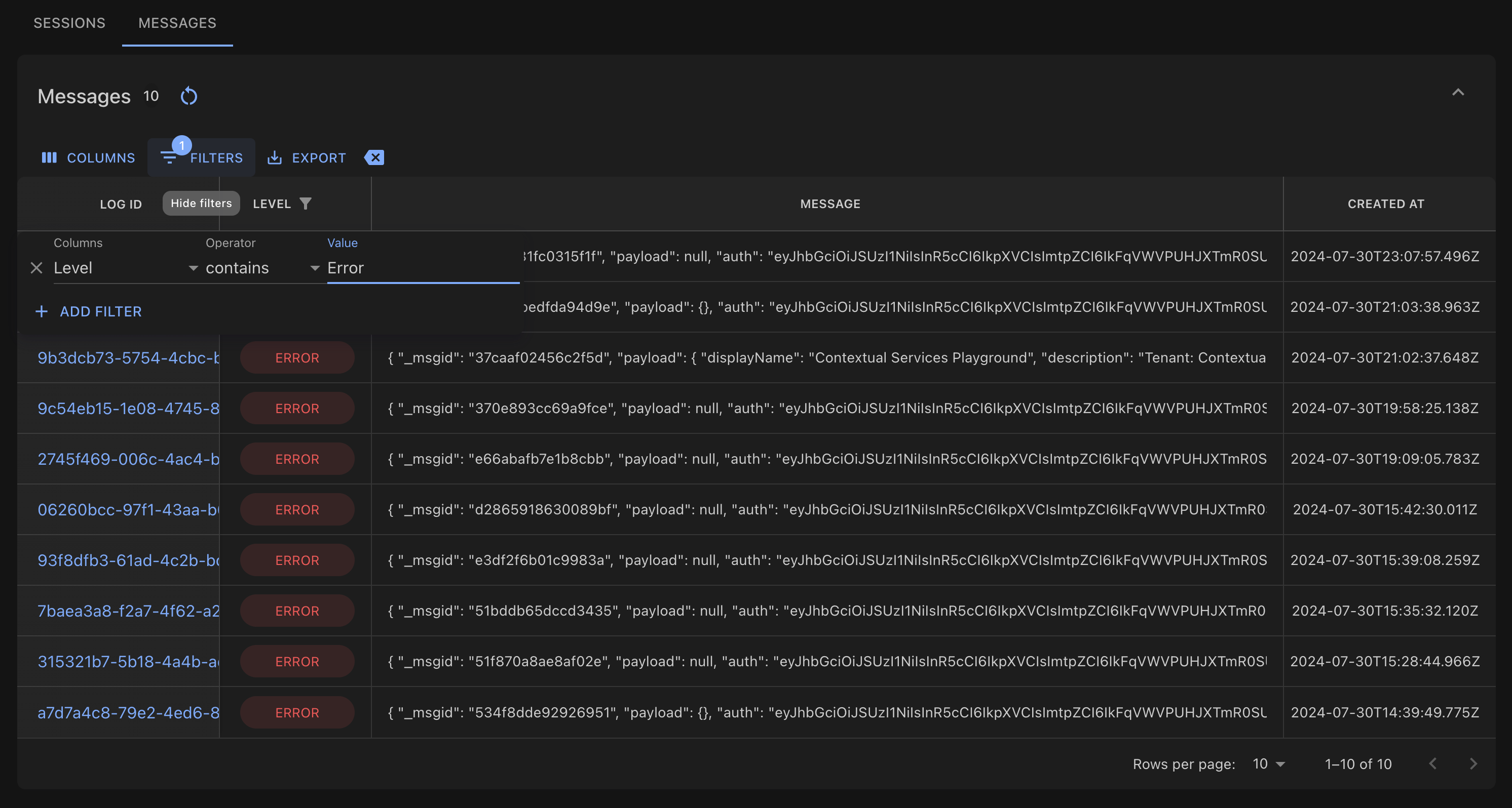 By filtering on the "level" column in the messages view, you can quickly find any errors logged for this agent.