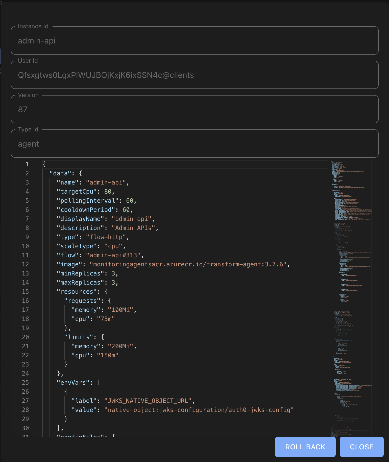 The view of each agent version shows the JSON for that agent version and not the form view that is typically used to edit the agent. However all of the same information is contained in the JSON, and a "rollback" button is provided at the bottom of the screen.
