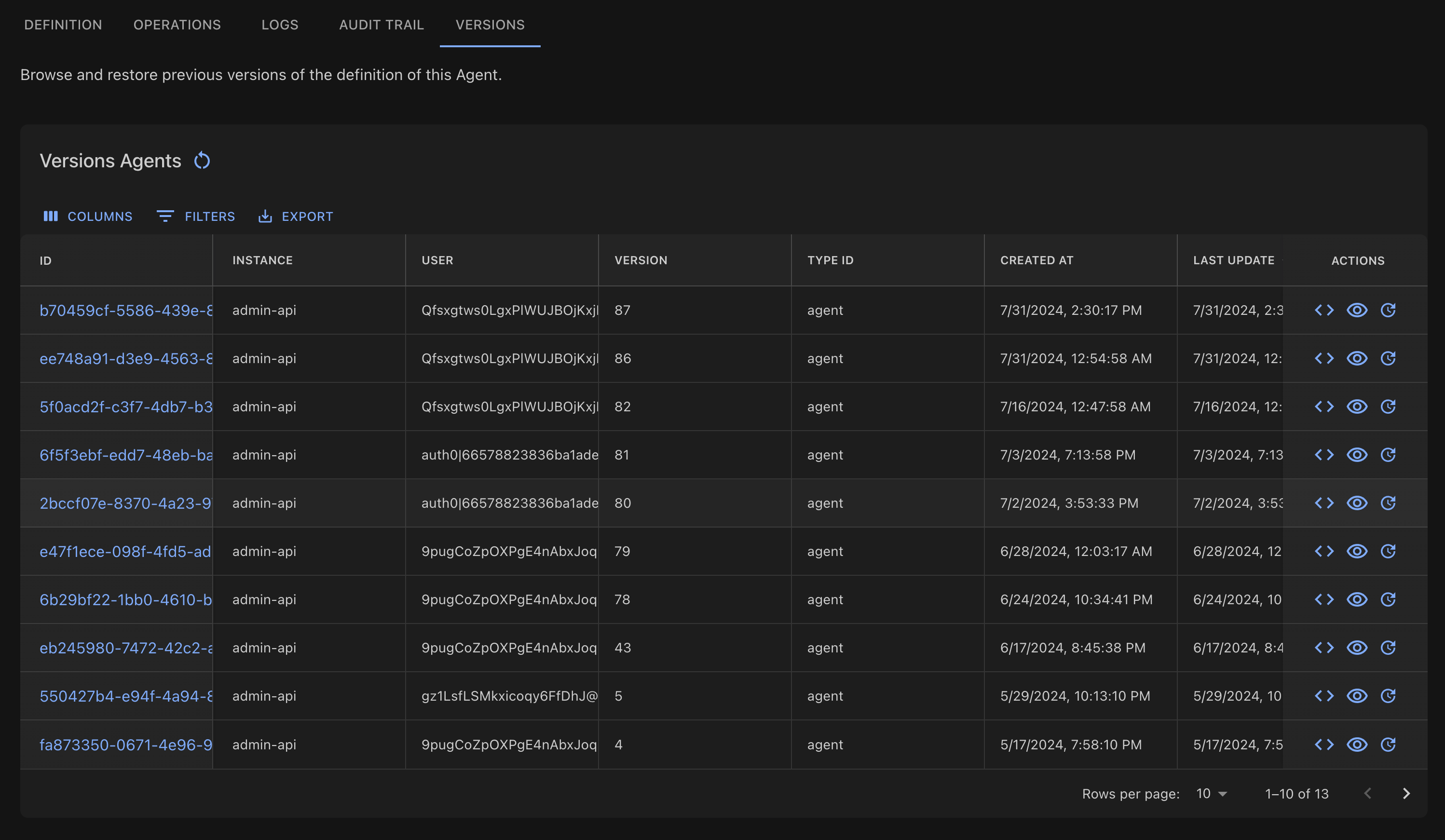The Versions tab shows each version of the agent. By clicking on the view icon you can view the configuration of that specific version of the agent, and rollback to that version as needed.