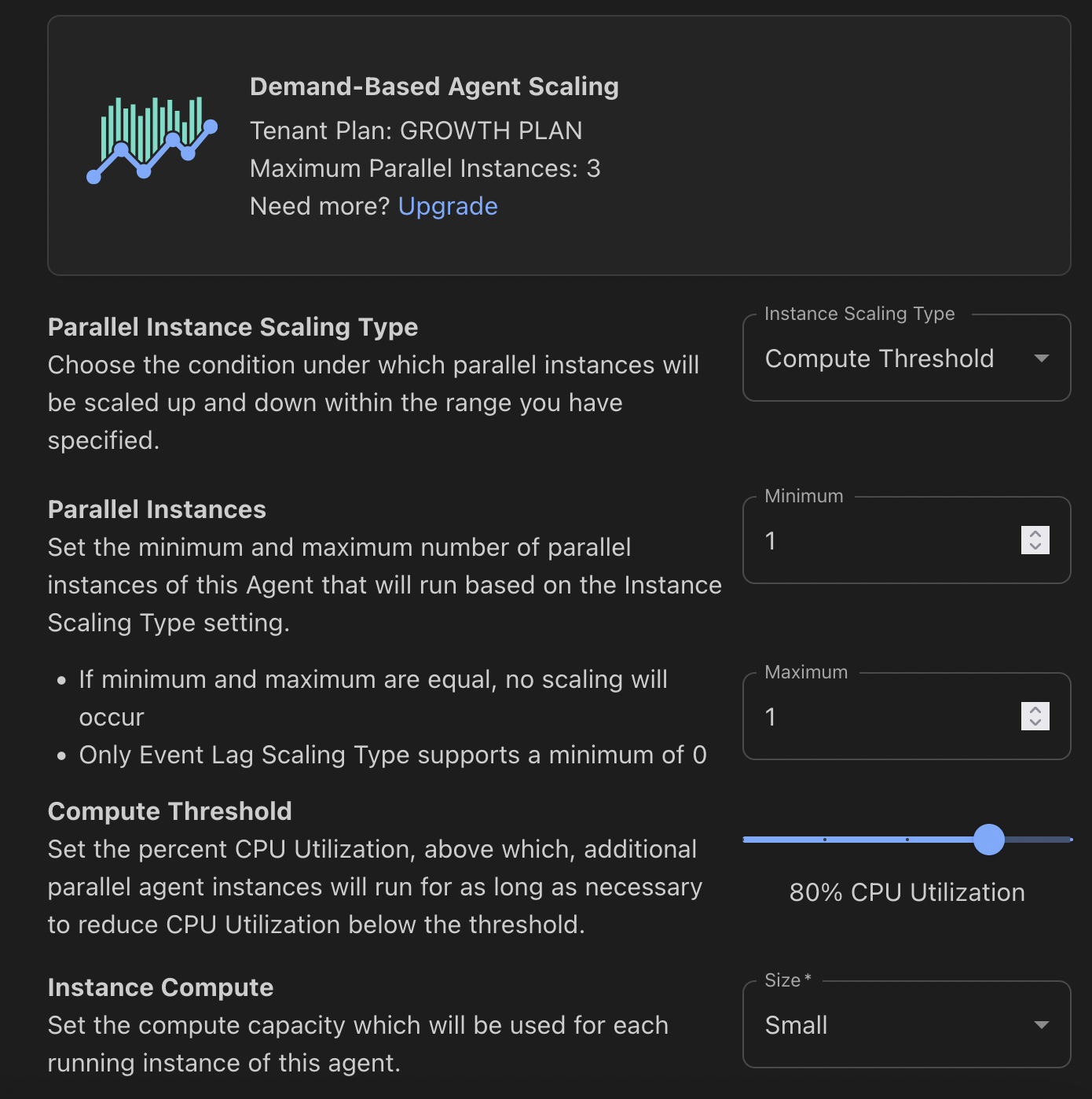 Additionally, on paid plans you can set scaling for your agents to create multiple instances to handle more load. Scaling can happen through either CPU-based utilization (for HTTP or Event-Based Agents) or Message Lag (for Event-Based Agents only).