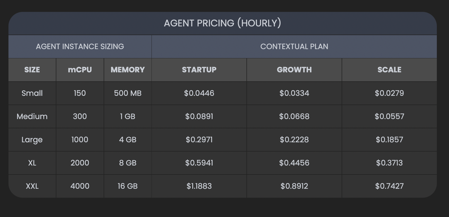 Agent instances can be one of 5 sizes, from Small to XXL. Each agent size comes with unique CPU (mCPUs) and memory (MB/GB). Each Agent size has distinct per hour prices based on your [service tier](https://www.contextual.io/pricing).