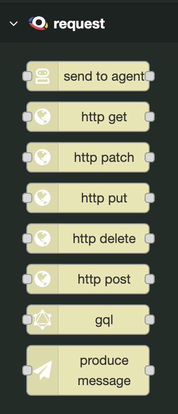 The send to agent node can be found in the "request" category in the palette in the flow editor.