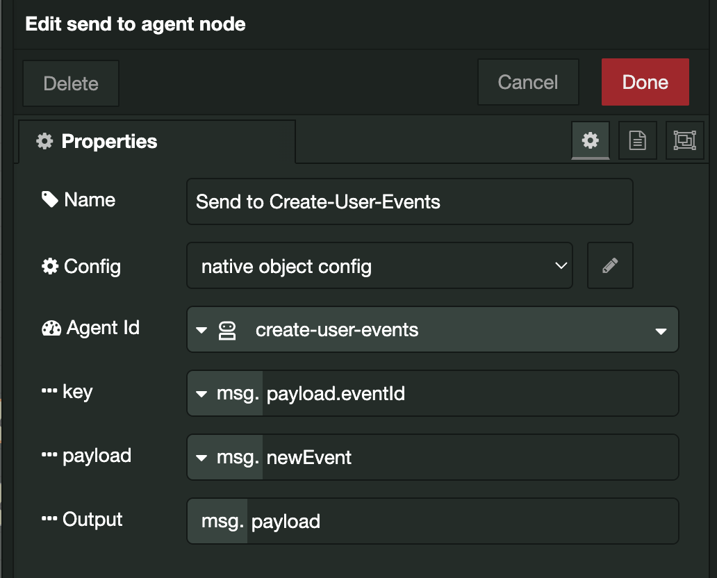 The Send To Agent node is very easy to use. Simply select the agent from the list "Agent Id" property and provide the optional key and required payload properties.