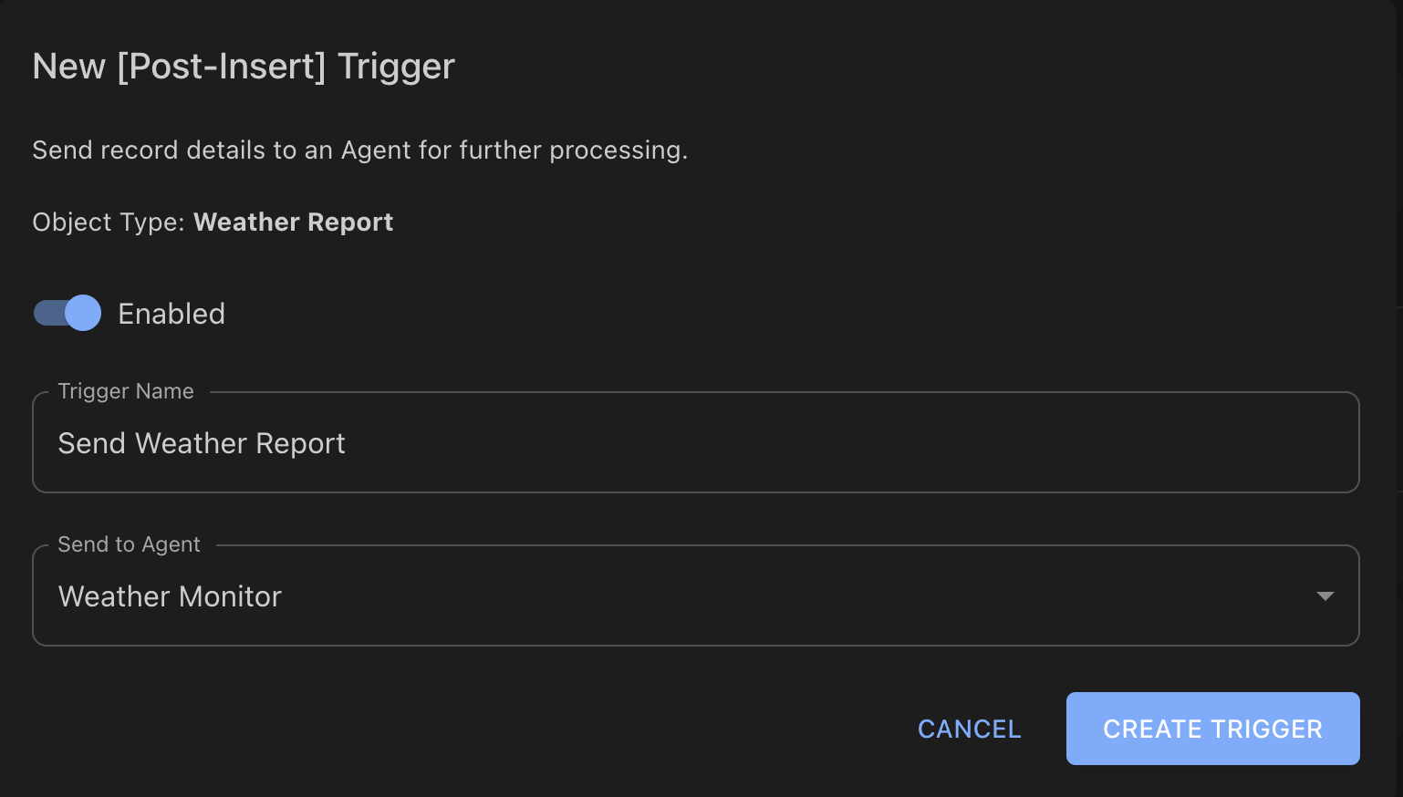 * Add a trigger to the existing weather-report native object to send the message (as an event) to the new agent POST-INSERT.