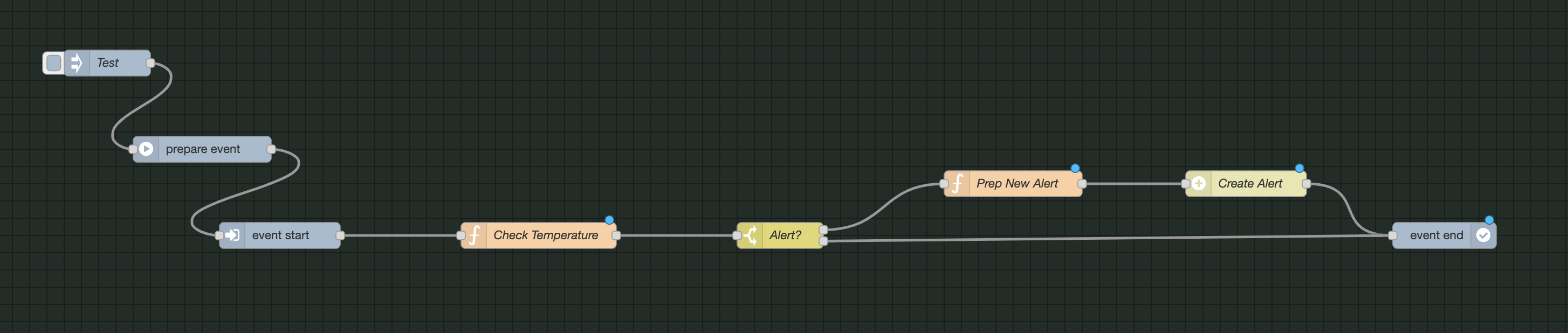 * Create an event-processing flow to monitor temperature data, either from manual submissions (like in Project 1) or through simulated temperature data (from an inject node). The goal is to detect temperature readings that fall outside of a set range (e.g., below 0°C or above 35°C) and create an alert object