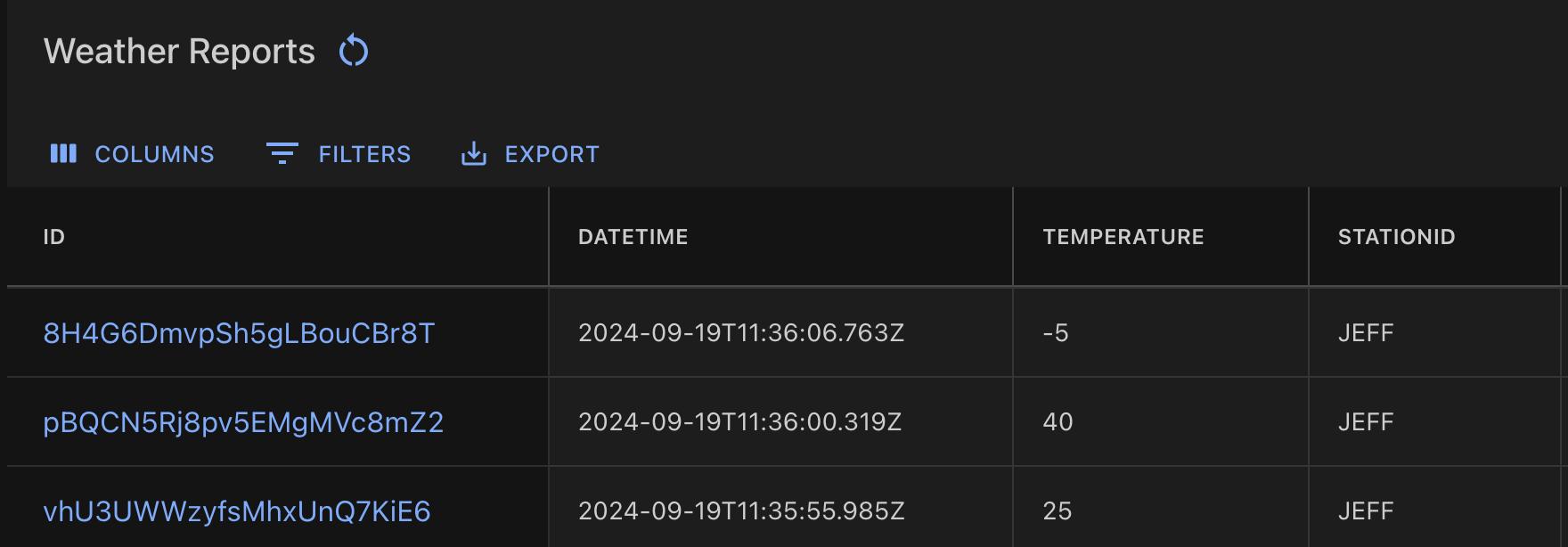 5. Now navigate to Records/Data/Weather Reports in the console and verify that you see all of these new reports, as shown below.
