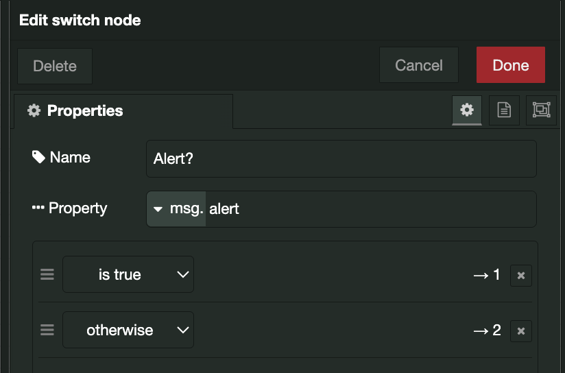 21. Open the function node and add the following JS. Give it a name: "Prep New Alert".