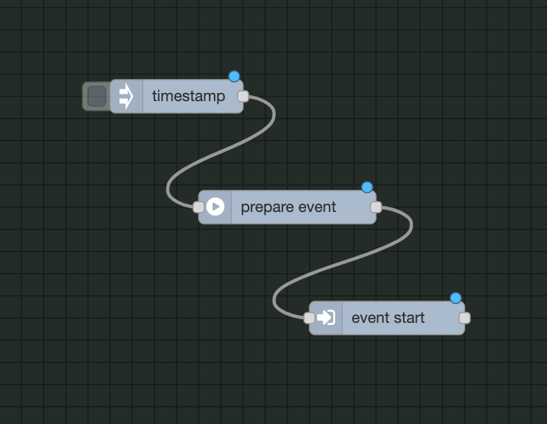 2. Add an Inject node, a Prepare Event node, and an Event Start node to the canvas as shown below.